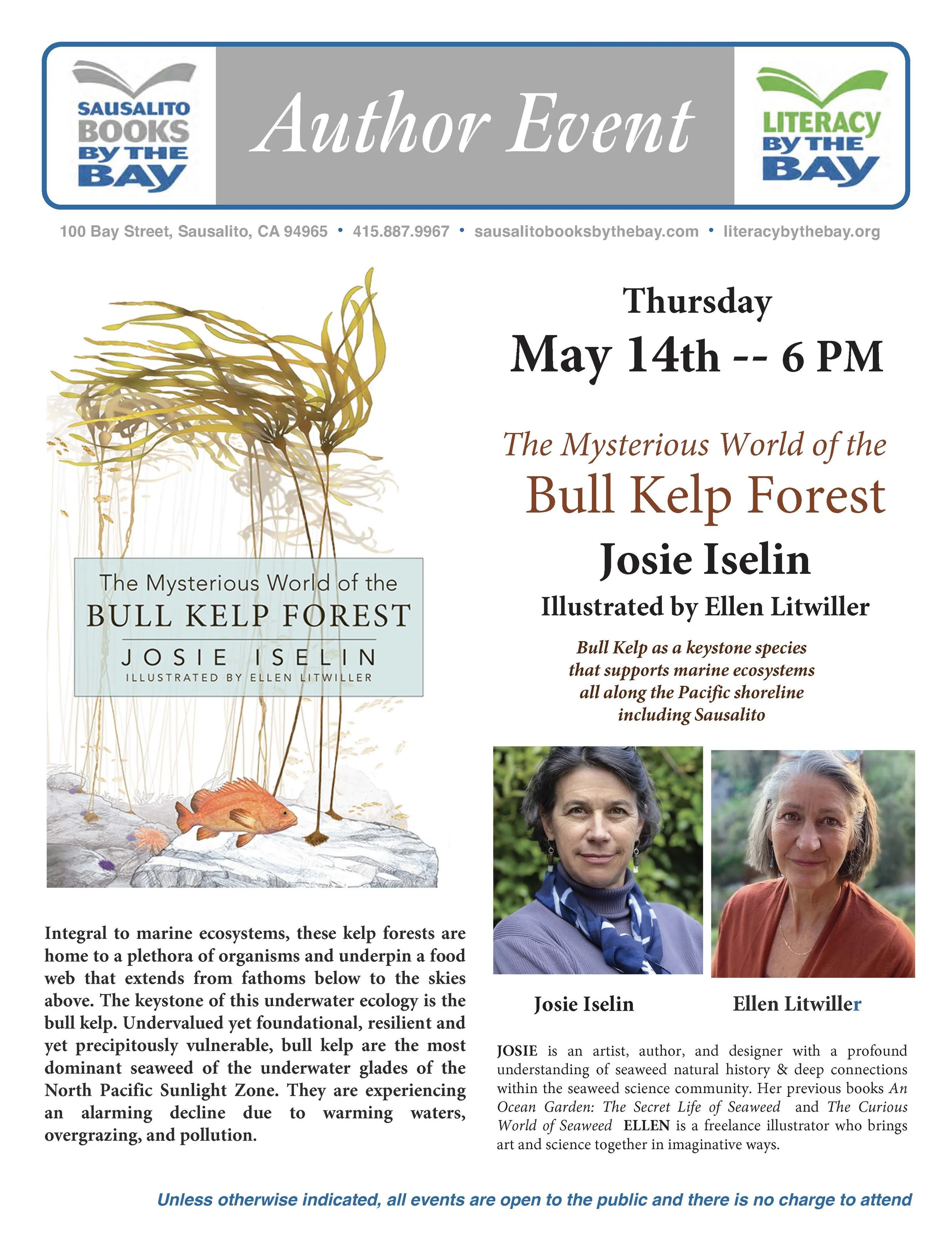 Author Event - Josie Iselin - "The Mysterious World of Bull Kelp Forest" Thursday, May 14, 2026 6:00 PM 7:00 PM 18:00 19:00 Sausalito Books by the Bay 100 Bay Street Sausalito, CA, 94965 United States (map) Google Calendar ICS Buy the Book